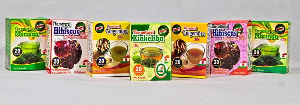 ✔ Valoriser les matières premières locales (kinkéliba, moringa, bissap, gingembre, tamarin…)